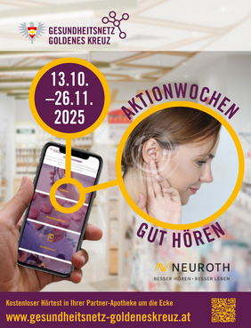Das ist folgenschwer, da nur durch eine rechtzeitige Behandlung ein Fortschreiten des Hörverlustes verhindert und die Lebensqualität deutlich verbessert werden können. Deshalb organisiert das Gesundheitsnetz Goldenes Kreuz die Aktionswochen „Gut Hören“, in deren Rahmen die Partner-Apotheken an jeweils einem Aktionstag kostenlos und unkompliziert einen Hörtest inklusive Beratung anbieten. Die Aktion findet in Kooperation mit Neuroth statt.