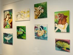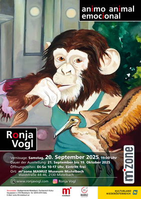 In ihrer Mistelbacher Ausstellung „animo animal emocional“ beleuchtet Ronja Vogl das Verhältnis von Mensch und Tier: Die ähnlichen Verhaltensweisen werden dargestellt und hinterfragt. Exotische Tiere werden eindrucksvoll auf Leinwand gebannt. Die Künstlerin setzt sich ebenso mit dem, durch den Menschen verursachte, Verschwinden vieler Tierarten auseinander.
