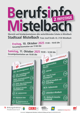 Die Berufsinfo:Mistelbach 2025 findet am Freitag, 10. Oktober, von 17.00 bis 19.45 Uhr sowie am Samstag, 11. Oktober, von 10.00 bis 12.00 Uhr im Stadtsaal in Mistelbach statt.
