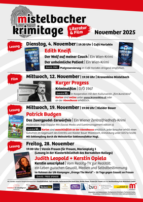 Spannung pur erwartet die Besucherinnen und Besucher, wenn von Dienstag, 4. bis Freitag, 28. November wieder Literatur und Film im Mittelpunkt der „Mistelbacher Krimitage“ stehen. Eine Doppellesung, zwei Einzellesungen sowie eine Filmvorführung stehen am diesjährigen Programm. Gestartet wird am Dienstag, 4. November, mit einer Lesung mit Edith Kneifl aus ihren beiden Krimis „Der Wolf auf meiner Couch“ und „Der unheimliche Patient“ im Café Harlekin. Beginn ist um 19.30 Uhr.