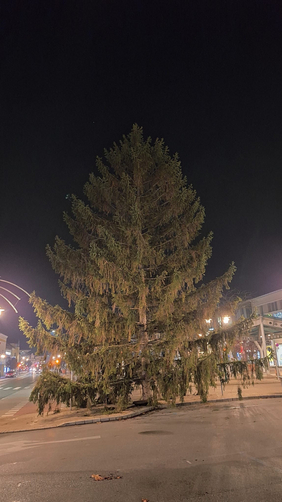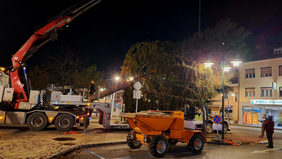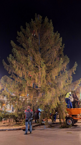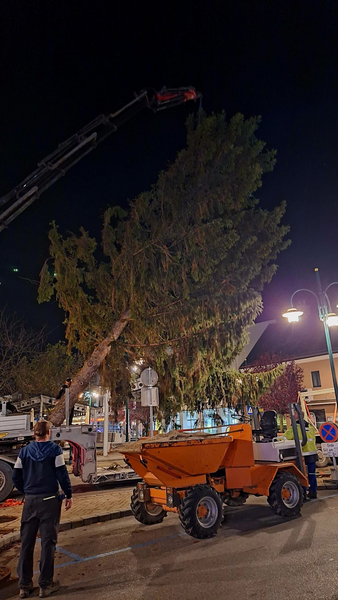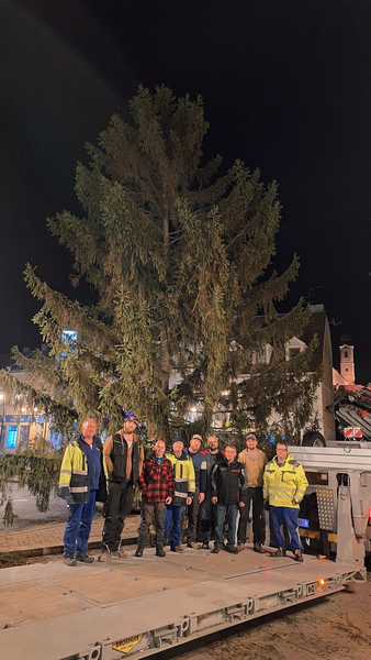 Er schmückt Jahr für Jahr in der Vorweihnachtszeit den Mistelbacher Hauptplatz: der Weihnachtsbaum vor dem Rathaus! Am Montag, 10. November, erhielt der diesjährige Baum seinen Platz für die nächsten Wochen. Familie Schindler aus Mistelbach stellte die rund 2,3 bis 2,7 Tonnen schwere und 16 Meter hohe Fichte mit einem Durchmesser von etwa zehn Meter am unteren Ende (Astende zu Astende; Anm.d.Red.) sowie einem Stammdurchmesser von etwa 65 Zentimeter zur Verfügung, die bislang in der Gartengasse stand. Für den reibungslosen Transport war auch heuer wieder – wie schon seit vielen Jahren – Josef Laber über die Firma Gruschina verantwortlich. Und die Familie Schindler versorgte im Anschluss alle Gemeindemitarbeiter mit Würstel und Getränken! Vielen Dank dafür!