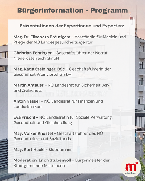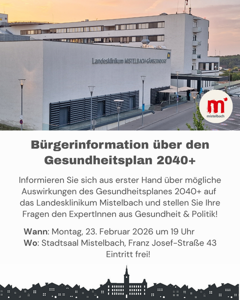 Mehr als 50 Expertinnen und Experten haben mehr als ein Jahr lang das Gesundheitswesen in Niederösterreich neu gedacht. Besonders im Fokus stand dabei, das Gesundheitswesen fit für bevorstehende Pensionierungswellen und veränderte Krankheitsbilder zu machen. Das Landesklinikum Mistelbach nimmt dabei als regionales Schwerpunktkrankenhaus auch in den nächsten Jahrzehnten eine wesentliche Rolle in der Gesundheitsversorgung des Weinviertels ein. Im Rahmen einer von der Stadtgemeinde Mistelbach organisierten Informationsveranstaltung für interessierte Bürgerinnen und Bürger am Montag, 23. Februar, im Stadtsaal Mistelbach informieren Expertinnen und Experten sowie Vertreterinnen und Vertreter aus der Politik und des Gesundheitswesens über den Gesundheitsplan 2040+ und die damit verbundenen Auswirkungen auf das Landesklinikum Mistelbach-Gänserndorf. Beginn ist um 19.00 Uhr, der Eintritt ist frei.
