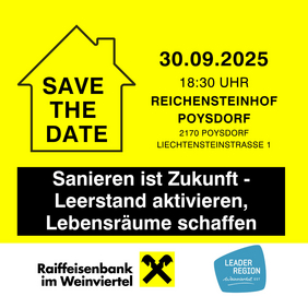 Organisiert wird der Abend von der Raiffeisenbank im Weinviertel als Partner für Finanzierungslösungen und der LEADER Region Weinviertel Ost, die sich für ein aktives Leerstandsmanagement und die Weiterentwicklung des Weinviertels einsetzt.