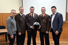 Sicherheitsstadträtin Andrea Hugl, Kommandant-Stellvertreter Florian Uhl, Kommandant Lucas Schaman, Ortsvorsteher Ing. Alois Nöstler und Gemeinderat Maximilian Lehner (nicht am Foto: Verwalter Lukas Schmatzberger)