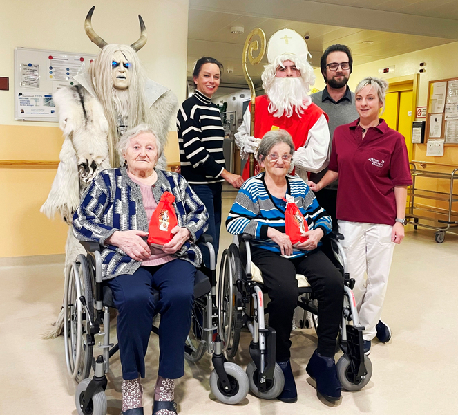 Zur besonderen Freude aller zog der Hl. Nikolaus in Begleitung des Krampus durchs NÖ Pflege- und Betreuungszentrum Mistelbach. Gemeinsam mit den Mitarbeiterinnen Ehrenamt und Alltagsbegleitung Christina Grobmann-Mehling und Erna Pesau stimmten die Bewohnerinnen und Bewohner das Lied „Lasst uns froh und munter sein…“ zu Ehren des Nikolaus an.