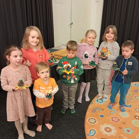 Nach der Geschichte wurde natürlich wieder fleißig gebastelt. Jedes Kind konnte sein eigenes, bunt geschmücktes Tannenbäumchen mit nach Hause nehmen.
