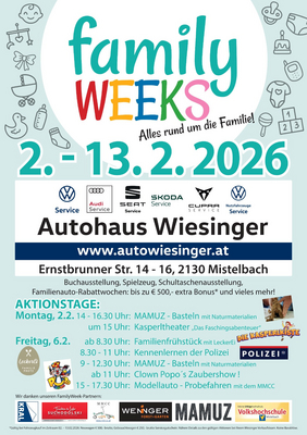 Während der zweiwöchigen Family Weeks kann die familienfreundliche Fahrzeugpalette in Kooperation mit zahlreichen regionalen Partnern und deren passendem Sortiment an einem zentralen Ort erlebt, getestet und verglichen werden. Außerdem wird sich die gesamten Family Weeks über im Autohaus die Buchhandlung KRAL Mistelbach präsentieren, wird eine Schultaschenausstellung und eine Trachtenmodenschau von der Firma Suchodolski abgehalten und es wird die Volkshochschule Mistelbach sowie die Firma Weninger Forst & Garten mit Kinderspielzeug von Husqvarna und Stihl vertreten sein.