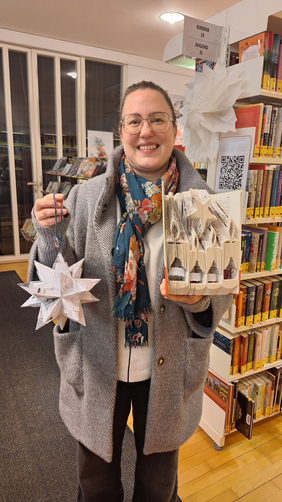 Die gefalteten Buchobjekte konnten von Montag, 1. bis Dienstag, 23. Dezember, während der Öffnungszeiten der Bibliothek besichtigt und gegen eine Spende erworben werden. Sie eignen sich als individuelle, handgefertigte und nachhaltige Weihnachtsgeschenke mit einer berührenden Geschichte.
